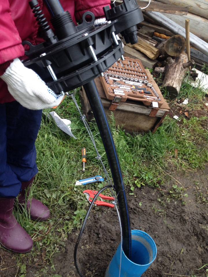 Это базовый вариант пользования водой из скважины: после бурения скважины в обсадную трубу опускается погружной насос (подвешивается на трос обязательно НЕРЖАВЕЙКА, от насоса наверх выводится труба ПЭ, кабель питания и сверху ставится герметичный оголовок . Вы включаете вилку в розетку и насос подает вам воду, можно подключать поливочный шланг, но нельзя перекрывать воду. В таком варианте на насос обратный клапан не ставится и после выключения насоса из розетки вода обратно стекает в скважину, поэтому зимой ничего не замерзнет. Колонку можно в любой момент времени дооборудовать и завести воду в дом.